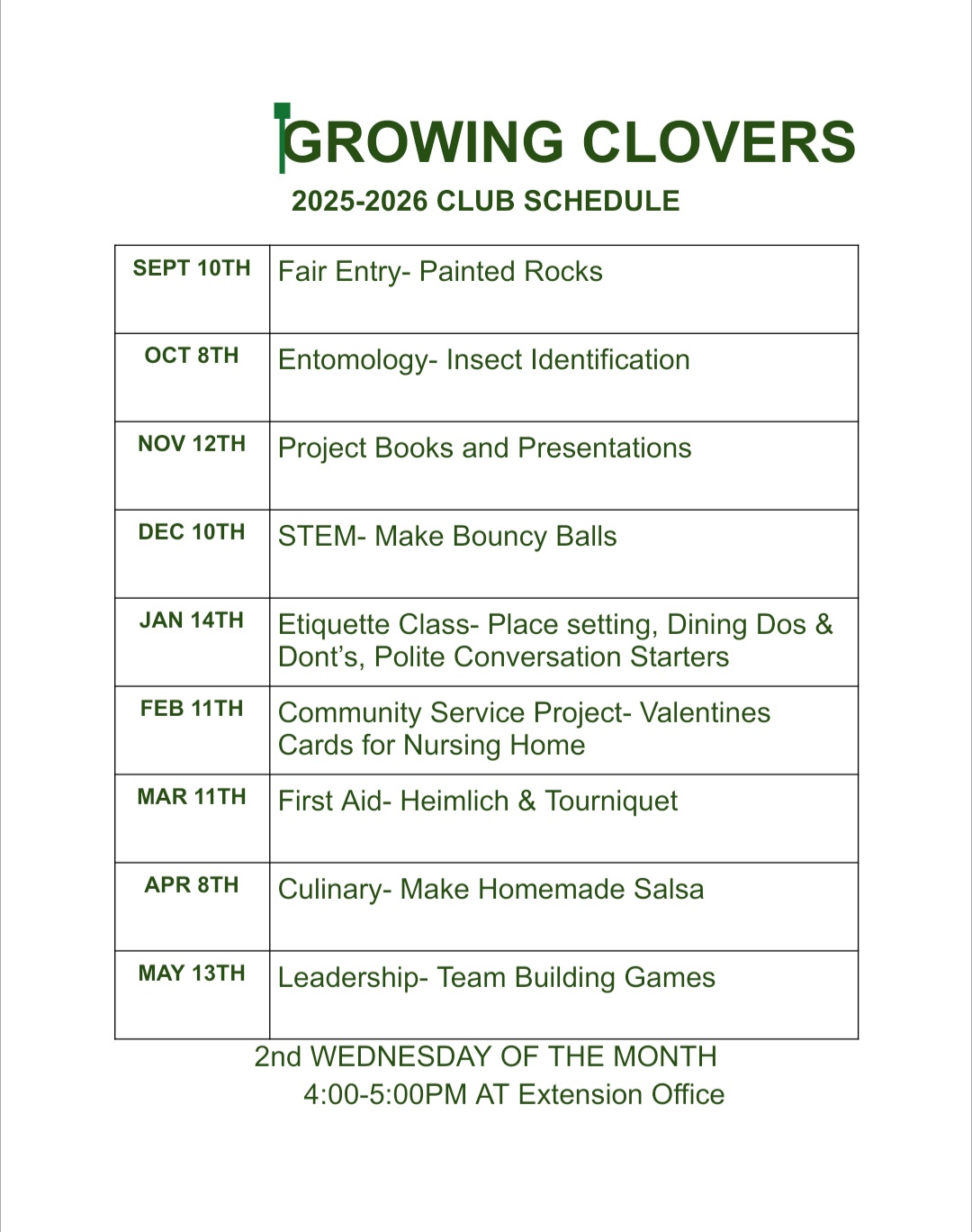 *Clubs meeting at 4:00 PM are scheduled as after-school meetings so members can take the bus and be dropped off at the Extension Office. Pick-up is required by 5:15 PM.
